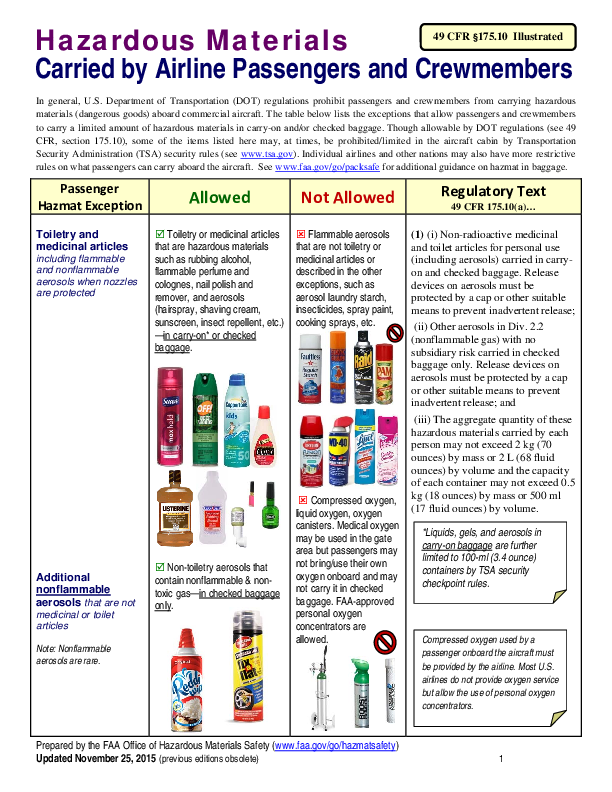 In general, U.S. Department of Transportation (DOT) regulations prohibit passengers and crewmembers from carrying hazardous materials (dangerous goods) aboard commercial aircraft. This table lists the exceptions that allow passengers and crewmembers to carry a limited amount of hazardous materials in carry-on and/or checked baggage.