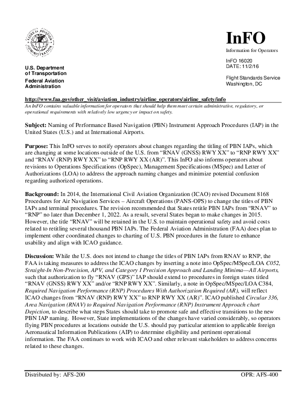 FAA InFO 16020: Naming of Performance Based Navigation (PBN) Instrument Approach Procedures (IAP)