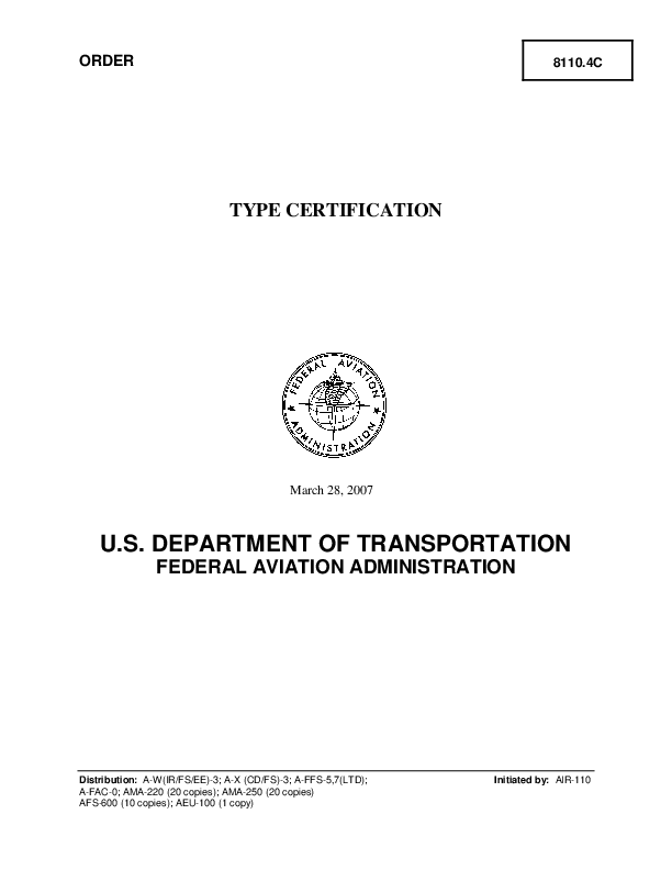 This change transmits revised pages to Order 8110.4C, Type Certification. This change is issued to remove procedures and forms related to the notification process used when initiating type certification projects, for the determination of directorate involvement, and for aircraft certification office (ACO) to ACO coordination. The revised certification project notification (CPN), directorate involvement determination, and ACO to ACO coordination procedures are now published in Order 8110.115, Certification Project Initiation and Certification Project Notification. This change also introduces a requirement for ACOs to submit updated Type Certificate Data Sheets (TCDSs) for posting on the RGL website no later than 30 calendar days after TC transfer to a new TC holder. And finally this change also includes a corrected title for figures 1 and 7 of appendix 2.