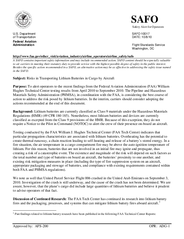 In this Safety Alert for Operators (SAFO), the FAA summarized recent research which shows that lithium metal (non-rechargeable) and lithium-ion (rechargeable) batteries are highly flammable and capable of igniting during air transport under certain circumstances. The research also indicates that Halon 1301, the suppression agent found in Class C cargo compartments, is ineffective in suppressing lithium metal battery fires.