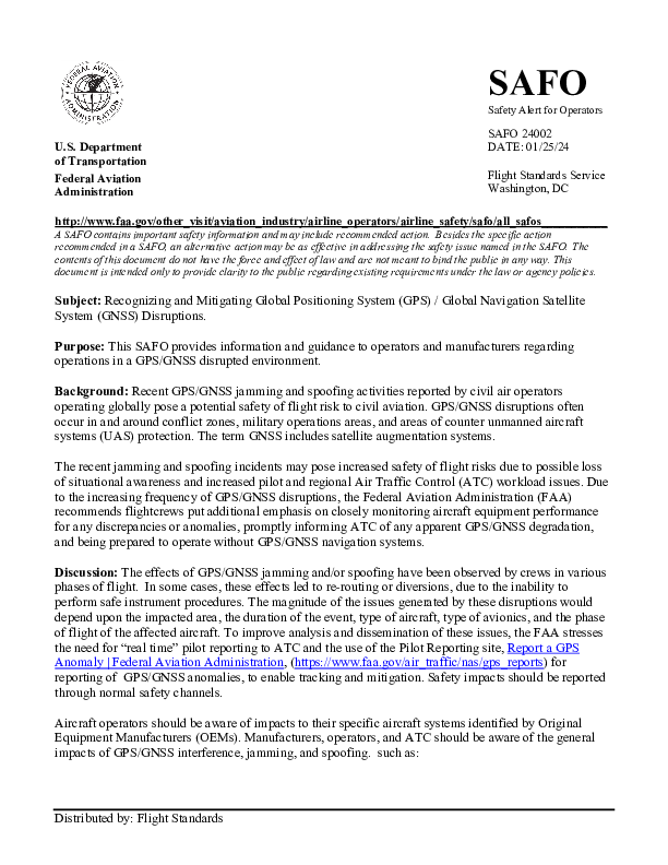 FAA SAFO 24002: Recognizing and Mitigating Global Positioning System (GPS)/Global Navigation Satellite System (GNSS) Disruptions