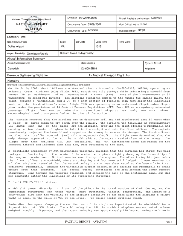 Factual Report ID:DCA02MA026, Canadair CL-600 Bird Strike at Washington Dulles Airport, 9 March 2002