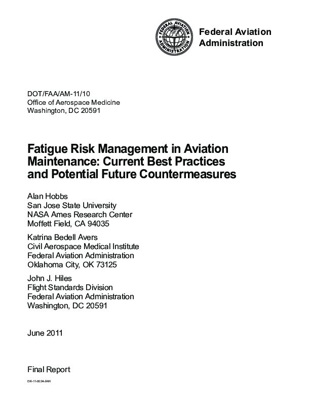 The unregulated hours and frequent night work characteristic of maintenance can produce significant levels of employee fatigue, with a resultant risk of maintenance error. Fatigue Risk Management Systems (FRMS) are widely used to manage fatigue among flight crew and drivers of commercial vehicles, but comprehensive approaches to fatigue risk management are still uncommon within maintenance organizations. In the wider transport industry, the objective of most FRMS has been to reduce fatigue to an acceptable level. Two additional objectives can be identified for FRMS in the maintenance environment: reducing or capturing fatigue-related errors, and minimizing the harm caused by fatigue-related errors. A range of countermeasures can help to achieve these three objectives in aviation maintenance. Some of these countermeasures are currently being applied within the industry, while others may become feasible in the future. The data available on best practices for fatigue risk management in aviation maintenance are continually evolving.