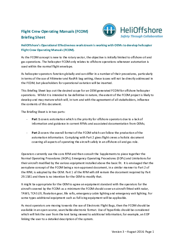 This Briefing Sheet lays out the desired scope for an OEM generated FCOM for offshore helicopter operations.