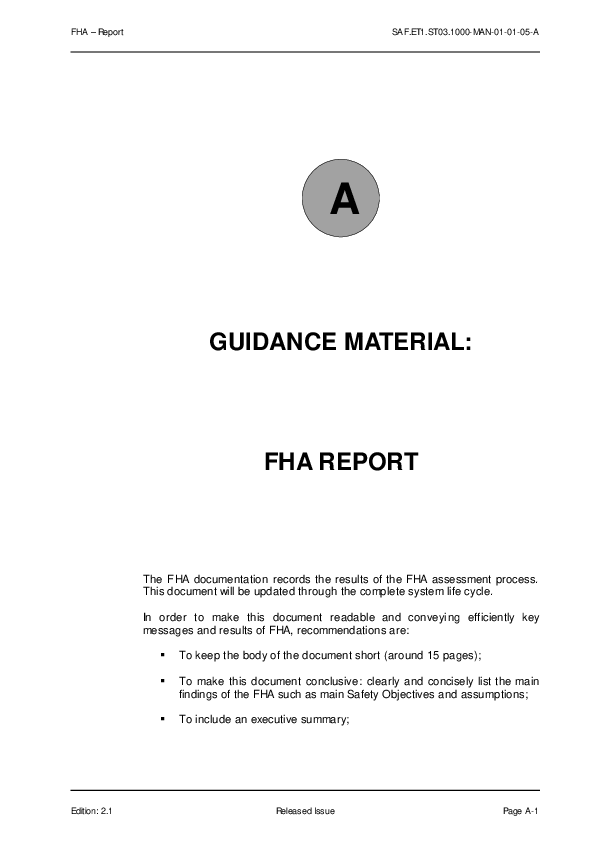 This guidance material proposes a template to report the FHA process. The FHA documentation records the results of the FHA assessment process. This document will be updated through the complete system life cycle.