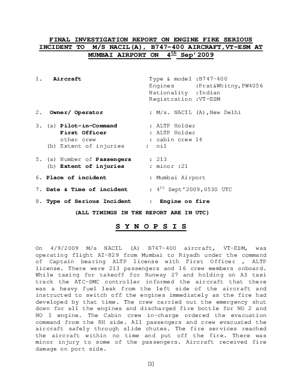Final Investigation Report on Engine Fire Seriuous Incident, B744, Mumbai Airport, 4 Sep 2009
