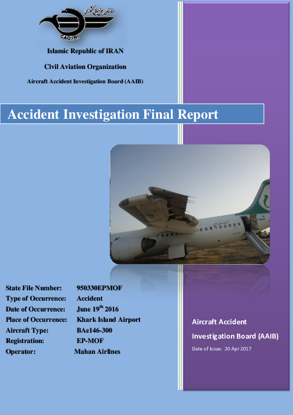 On 19 June 2016, a BAe 146-300 landed long at Khark Island and overran the end of the runway at speed with the aircraft only stopping because the nose landing gear collapsed on encountering uneven ground. The Investigation attributed the accident - which caused enough structural damage for the aircraft to be declared a hull loss - entirely to the decisions and actions of the aircraft commander who failed to go around from an unstabilised approach, landed long and then did not ensure maximum deceleration was achieved. The monitoring role of the low experience First Officer was ineffective.