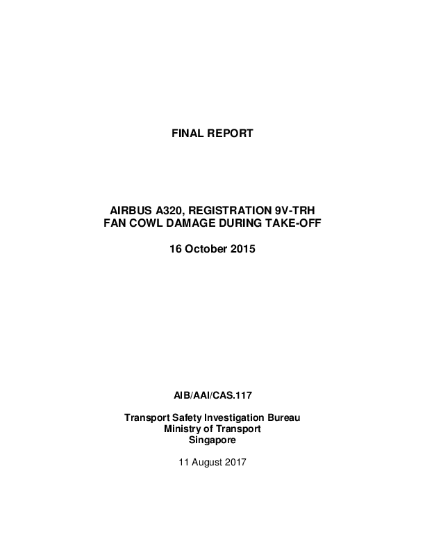 Final Report A320 (9V-TRH) fan cowl incident at Singapore 16 Oct 2015