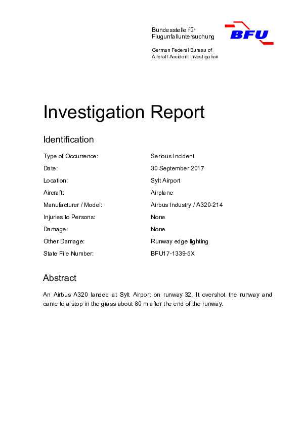 On 30 September 2017, an Airbus A320 touched down late after an ILS approach to runway 32 at Sylt with a significant tailwind component being reported and failed to stop before overrunning the end of the runway and subsequently stopped on grass 80 metres beyond it. The Investigation noted that the calculated required landing distance was close to the landing distance available, the actual approach speed was 20 knots above the calculated one and that the aircraft had floated in the flare above a wet runway. It was concluded that the runway excursion was attributable to non-performance of a go-around.