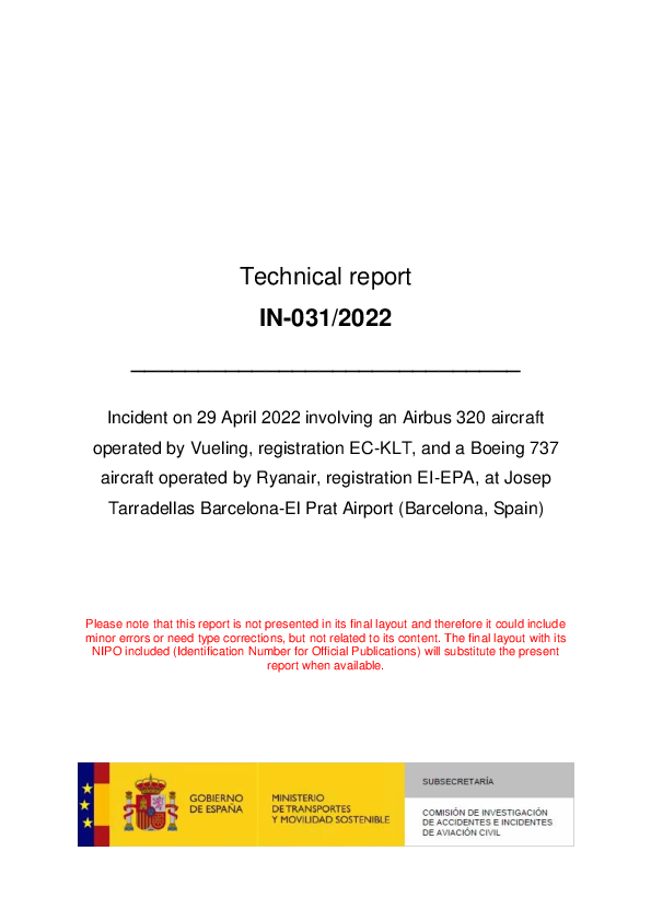Final Report A320 (EC-KLT) & B738 (EI-EPA), Barcelona Spain, 29 April 2022