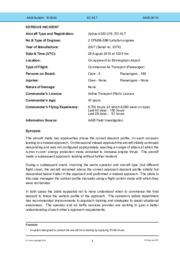 On 26 August 2019, an Airbus A320 attempted two autopilot-engaged non-precision approaches at Birmingham in good weather before a third one was successful. Both were commenced late and continued when unstable prior to eventual go-arounds, for one of which the aircraft was mis-configured causing an ‘Alpha Floor’ protection activation. A third non-precision approach was then completed without further event. The Investigation noted an almost identical event involving the same operator four months later, observing that all three discontinued approaches appeared to have originated in confusion arising from a slight difference between the procedures between the aircraft operator’s and AIP plates’.