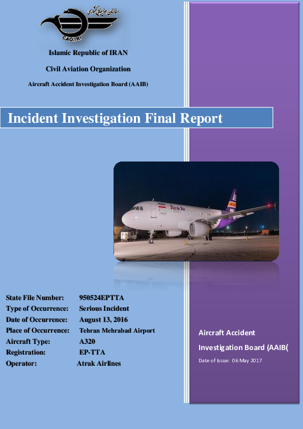 Final Report A320 (EP-TTA) Tehran Mehrabad Iran, 13 Aug 2016