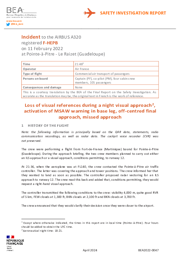 Final Report A320 (F-HEPB), vicinity Pointe-à-Pitre - Le Raizet Guadeloupe French Antilles, 11 Feb 2022