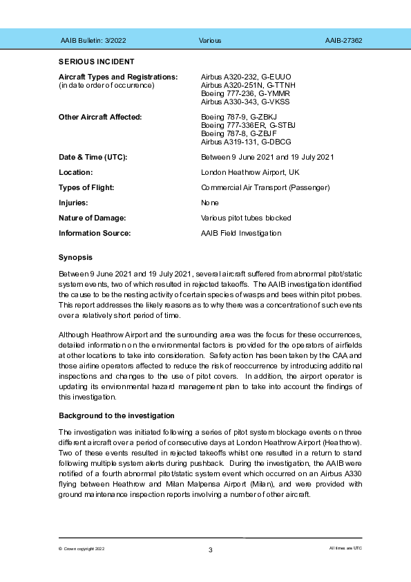 On 9 June 2021, an Airbus A320 Captain performing a relatively light weight and therefore rapid-acceleration takeoff from London Heathrow recognised as the standard 100 knot call was imminent that he had no speed indication so announced and performed a high speed rejected takeoff. Subsequent maintenance inspection found that the left pitot mast was blocked by the nest of a seasonally active solitary flying insect, noting that the aircraft had previously been parked for 24 hours on a non-terminal stand. Similar events, including another rejected takeoff, then followed and a comprehensive combined Investigation found all were of similar origin.