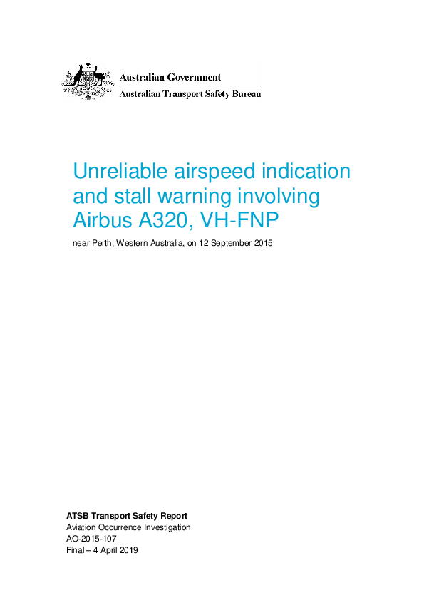 Final Report A320 (VH-FNP) Unreliable airspeed indication and stall warning, 12 Sept 2015