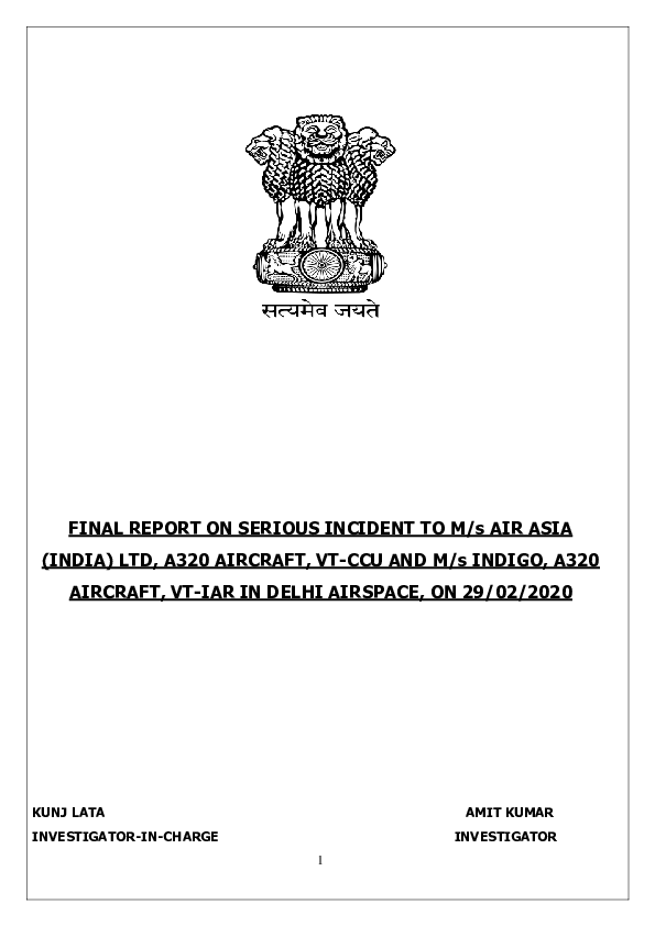 Final Report A320 VT-CCU) & A320 (VT-IAR), vicinity Delhi India, 29 February 2020