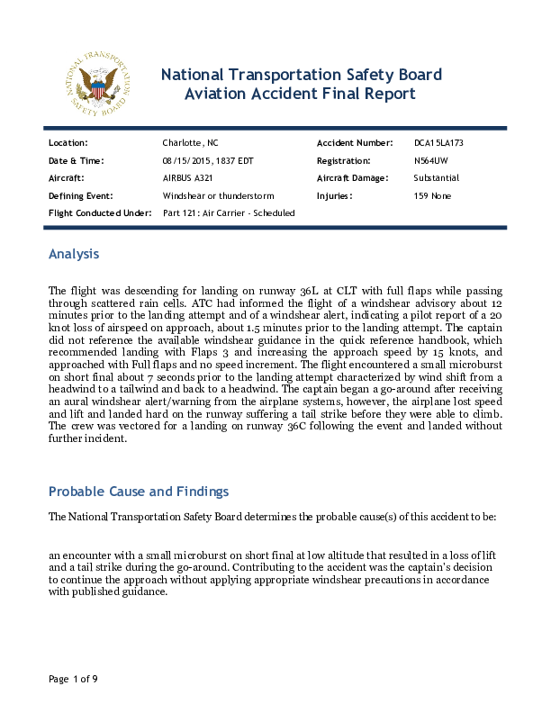 On 15 August 2015, an Airbus A321 on approach to Charlotte commenced a go around but following a temporary loss of control as it did so then struck approach and runway lighting and the undershoot area sustaining a tail strike before climbing away. The Investigation noted that the 2.1g impact caused substantial structural damage to the aircraft and attributed the loss of control to a small microburst and the crew’s failure to follow appropriate and recommended risk mitigations despite clear evidence of risk given by the aircraft when it went around and available visually.