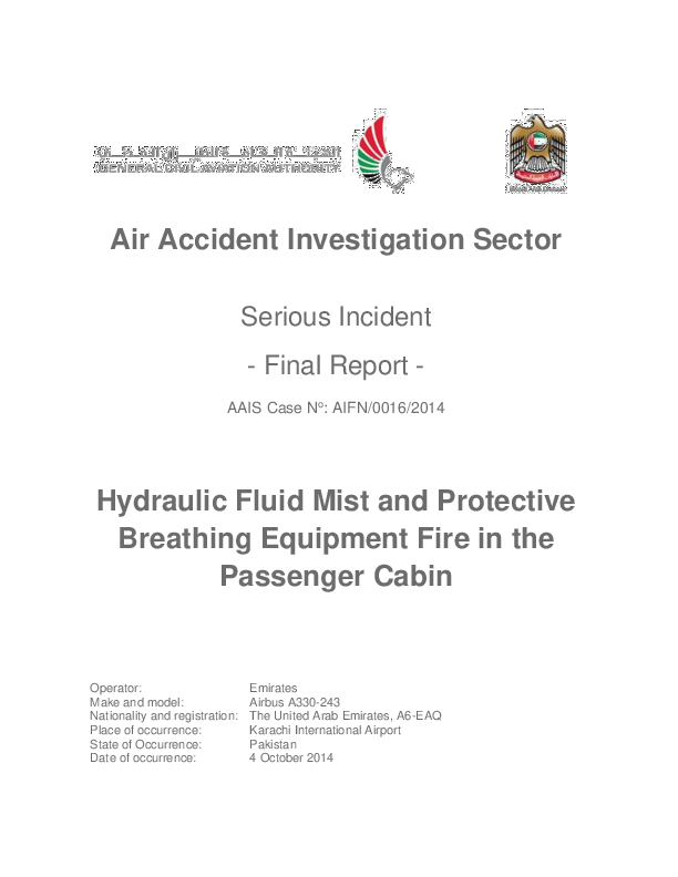 Final Report A332 (A6-EAQ) Karachi Pakistan 4 Oct 2014 Hydraulic Fluid Mist, PBE Fire