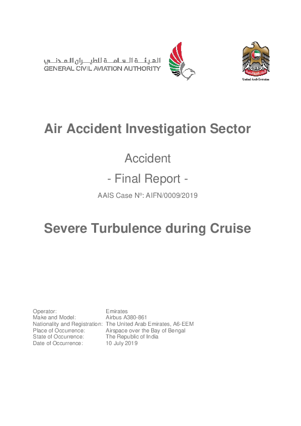 On 10 July 2019 an Airbus A380 in the cruise at night at FL 400 encountered unexpectedly severe turbulence approximately 13 hours into the 17 hour flight and 27 occupants were injured as a result, one seriously. The detailed Investigation concluded that the turbulence had occurred in clear air in the vicinity of a significant area of convective turbulence and a jet stream. A series of findings were related to both better detection of turbulence risks and ways to minimise injuries if unexpectedly encountered with particular reference to the aircraft type and operator but with wider relevance.