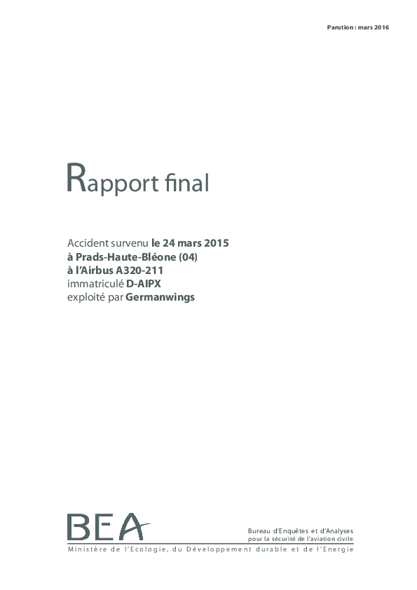 Final Report in French Accident on 24 March 2015 at Prads-Haute-Bl one (Alpes-de-Haute-Provence, France) to the Airbus A320-211 registered D-AIPX operated by Germanwings