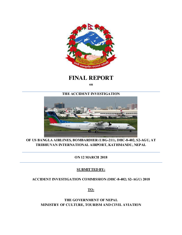 FINAL REPORT ON THE ACCIDENT INVESTIGATION OF US BANGLA AIRLINES (UBG-211), BOMBARDIER DHC-8-402, S2-AGU, AT TRIBHUVAN INTERNATIONAL AIRPORT, KATHMANDU, NEPAL ON 12th MARCH 2018