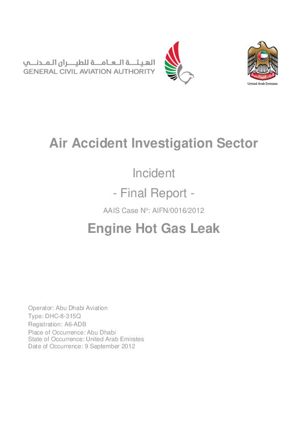 Engine Hot Gas Leak Name of the Operator : Abu Dhabi Aviation Manufacturer : Bombardier Inc., Canada Aircraft model : DHC-8-315Q Nationality : United Arab Emirates Registration : A6-ADB State of Occurrence : The United Arab Emirates Place : Departure from Abu Dhabi International Airport Date and time : 9 September 2012, 0649 Local Time