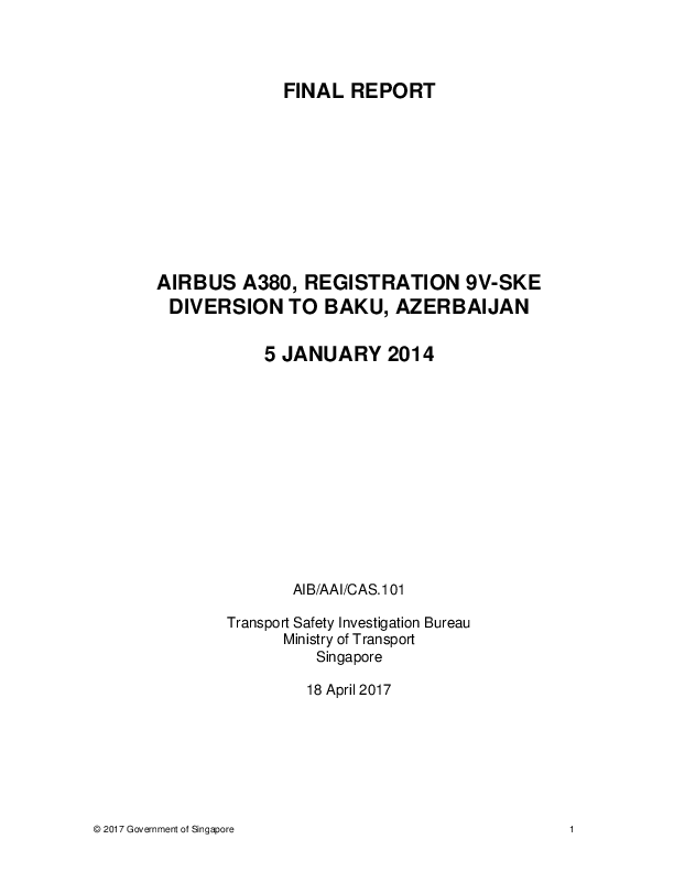 Final Report Airbus A380, Registration 9V-SKE Diversion To Baku, Azerbaijan 5 January 2014