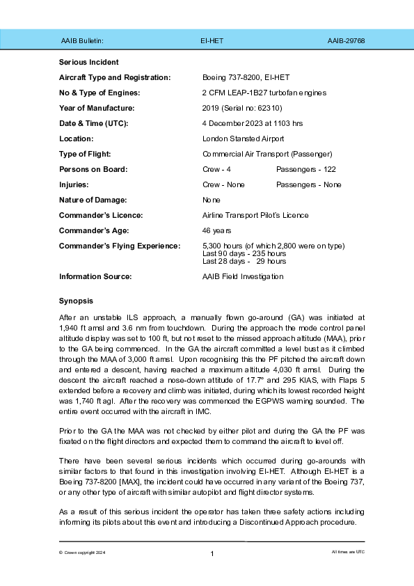 On 4 December 2023, a Boeing 737-8200 crew misjudged positioning onto the ILS approach for arrival at London Stansted. Having decided to go around, they then continued to climb above the 3,000 feet missed approach altitude which they had failed to set until alerted by the controller. The descent following a 1,000 feet level bust then continued back through the missed approach altitude at almost 9,000 fpm with an EGPWS ‘PULL UP’ Warning just as recovery from 1,740 feet agl was being initiated. After levelling at 3,000 feet, radar-vectoring onto the ILS was provided with the approach then completed normally.