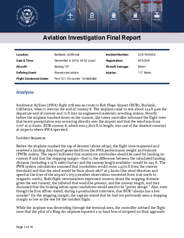 Final Report B737 (N752SW), Burbank CA USA, 6 December 2018