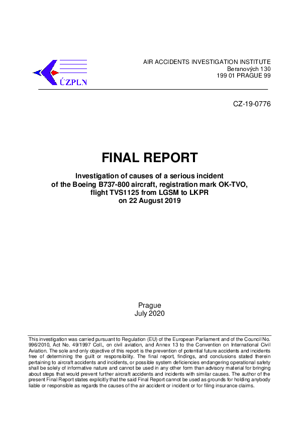 Final Report B738 (OK-TVO) enroute Aegean Sea, 22 August 2019