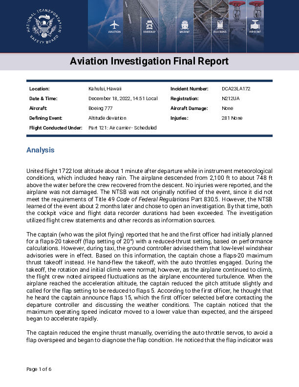 Final Report B772 (N212UA), vicinity Kahului Hawaii USA, 18 December 2022