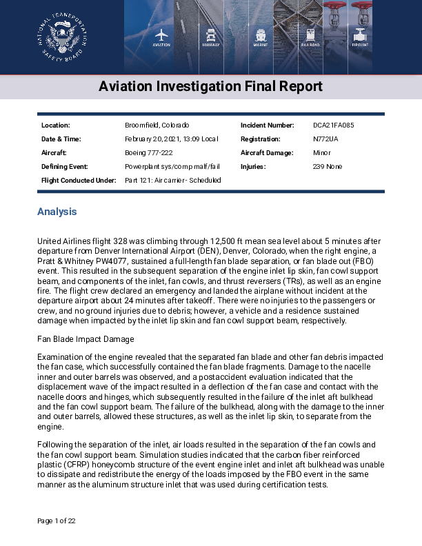 On 20 February 2021, a Boeing 777-200 climbing through 12,500 feet experienced a sudden right engine failure and fire shortly after thrust had been increased before entering airspace where moderate turbulence was expected. Despite actioning the corresponding drills, the fire did not go out until shortly before landing back at Denver. Engine debris fell to the ground over a wide area, fortuitously with only damage and no injuries. The failure was found to have been initiated by the fatigue failure of a single fan blade after required routine inspections had failed to find early-stage evidence of such a risk.