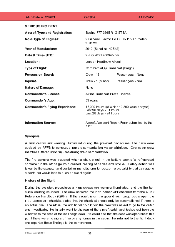 On 2 July 2021, during pre-departure loading of a Boeing 777-300 at Heathrow prior to passenger boarding with only the operating crew on board, a rear hold fire warning was annunciated and smoke and fumes subsequently entered the passenger cabin. The Investigation found that the source was a refrigerated container which had been subject to abnormal external impact prior to or during loading causing a short circuit in its battery pack. The refrigeration system involved was found by design to inhibit fire following a short circuit but it was noted that QRH response procedures did not apply to the circumstances.