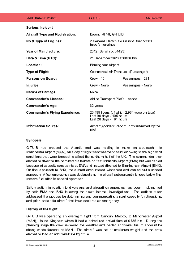On 21 December 2023 a Boeing 787-8 crew inbound to Manchester on a day of significant weather-related flight disruption over northern England, decided to divert to their nominated alternate East Midlands but when a landing there was denied, the flight proceeded to the nearest available alternate, Birmingham. After a windshear-related missed approach and subsequent low fuel MAYDAY declaration, a second approach led to a successful landing but with significant use of final reserve fuel. The operators of East Midlands and Birmingham airports subsequently revised their procedures for determining and communicating capacity for diversions and prioritising flights declaring low fuel emergencies.