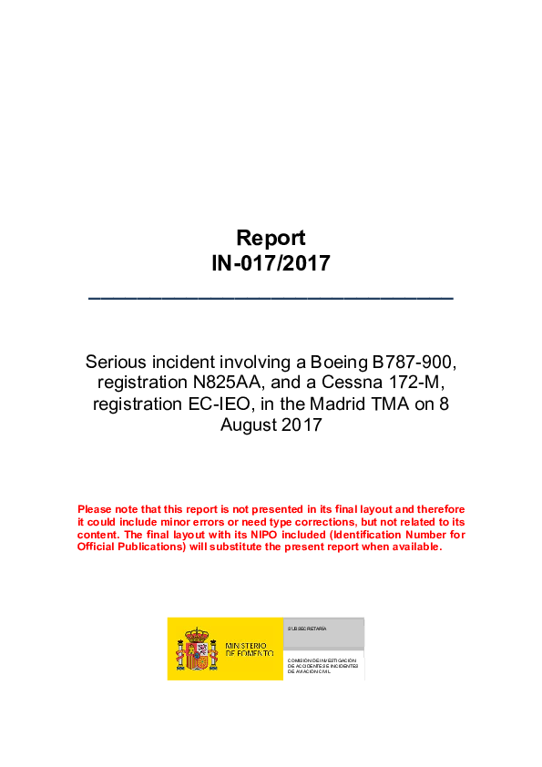 Final Report B789 (N825AA) / C172 (EC-IEO) en route northwest of Madrid Spain, 8 Aug 2017
