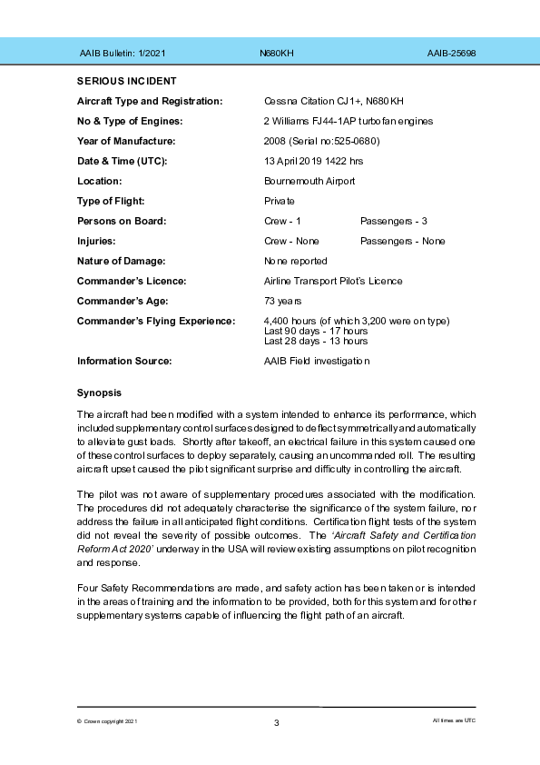 On 13 April 2019, an experienced Cessna 525 pilot almost lost control shortly after takeoff from Bournemouth when a recently installed performance enhancement system malfunctioned. After a six minute flight involving a potentially hazardous upset and recovery of compromised control, the turn back was successful. The Investigation found that although the pilot was unaware of the supplementary procedures supporting the modification, these did not adequately address possible failure cases. Also, certification flight tests prior to modification approval did not identify the severity of some possible failure outcomes and corresponding Safety Recommendations were made to the system manufacturer and safety regulators.