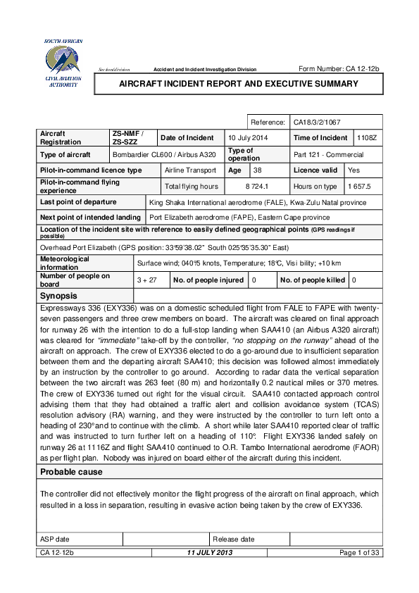 On 10 July 2014, Bombardier CRJ-200 instructed to go around at Port Elizabeth by ATC came into close proximity with an A320 which had just taken off from the same runway and initiated avoiding action to increase separation.