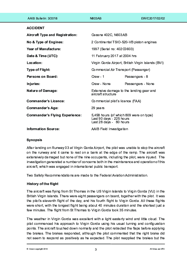 Final Report Cessna 402C, N603AB, Virgin Gorda British Virgin Islands, 11 Feb 2017