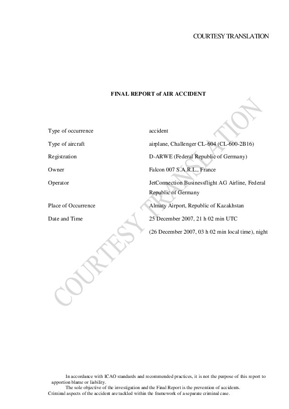On 26 December 2007, a Bombardier CL 604 Challenger being operated by Germany Company Jet Connection Business Flight on a private charter flight from Almaty to Macao took off at night into icing conditions from a 4398m runway which was covered by dry snow and roll control was lost just after beginning rotation. The aircraft wing tip impacted the runway surface and the aircraft subsequently crashed through the perimeter fence, the fuselage broke into three pieces and a fire started. The co pilot was killed and the other three occupants sustained serious injuries.