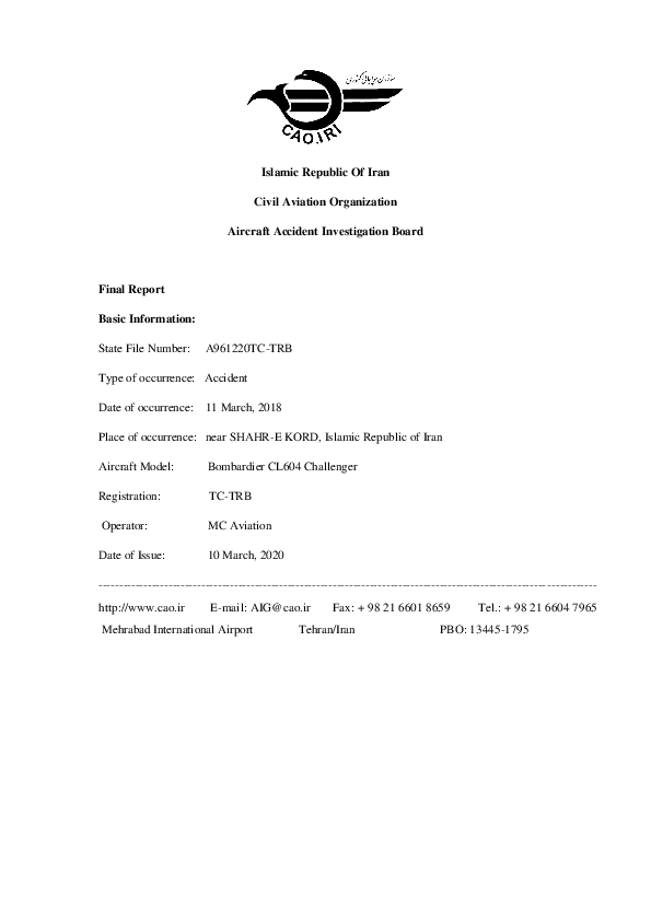 Final Report CL60 (TC-TRB), southwest of Shahr-e-Kord Iran, 11 Mar 2018