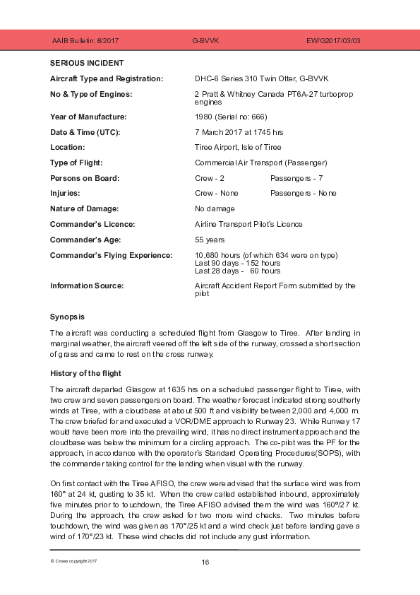 AAIB Bulletin: 8/2017 G-BVVK EW/G2017/03/03 On 7 March 2017, a DHC-6-300 left the side of the runway after touchdown in what the crew believed was a crosswind component within the Operator's crosswind limit. The Investigation concluded that the temporary loss of control of the aircraft was consistent with the occurrence with a sudden gust of wind above the applicable crosswind limits and noted the reliance of the crew on 'spot' winds provided by TWR during the final stages of the approach.