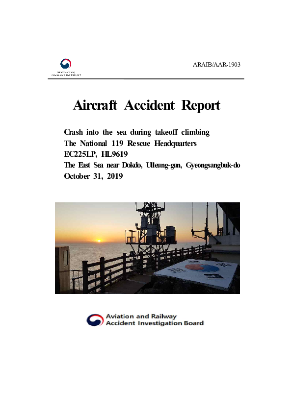 On 31 October 2019, an Airbus Helicopters EC225LP departing a helipad at Dokdo at night crashed into the sea after the Pilot lost situational awareness and failed to respond to last minute alerts from both the travelling engineer and the Co-Pilot to the clearly unintended descending flight path. All seven occupants were killed and the helicopter was destroyed. The absence of a departure briefing was assessed as specifically contributory but the main findings as to the underlying context for the accident were extensive procedural inadequacies in respect of the operational safety regime under which emergency medical flights were being conducted.