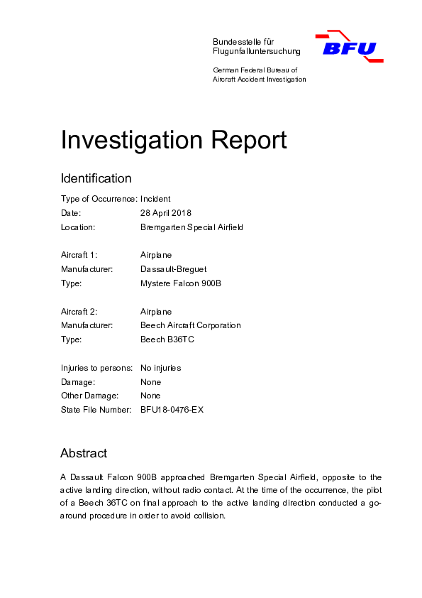 Final Report F900 (I-TARH) & BT36 (D-EBCF), Bremgarten Germany, 28 April 2018