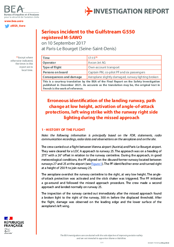 On 10 September 2017, the First Officer of a Gulfstream G550 making an offset non-precision approach to Paris Le Bourget failed to make a correct visual transition and after both crew were initially slow to recognise the error, an unsuccessful attempt at a low-level corrective realignment followed. This had not been completed when the auto throttle set the thrust to idle at 50 feet whilst a turn was being made over the runway ahead of the displaced threshold and one wing was in collision with runway edge lighting. The landing attempt was rejected and the Captain took over the go-around.