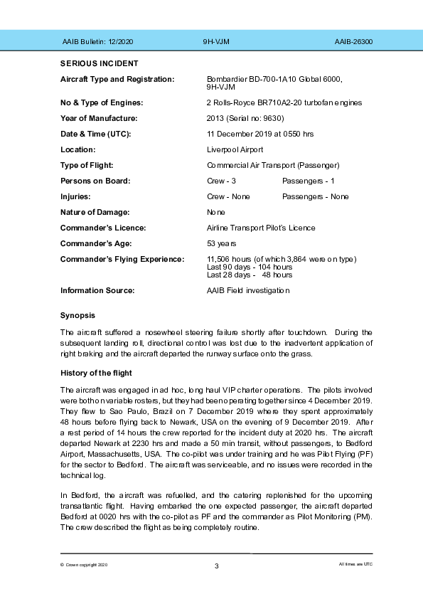 On 11 December 2019, a Bombardier BD700 Global 6000 making a night landing at Liverpool suffered a nose wheel steering failure shortly after touchdown. The crew were unable to prevent the aircraft departing the side of the runway into a grassed area where it stopped, undamaged, in mud. The Investigation found that the crew response was contrary to that needed for continued directional control but also that no pilot training or QRH procedure covered such a failure occurring at high speed nor was adequate guidance available on mitigating the risk of inadvertent opposite brake application during significant rudder deflection.