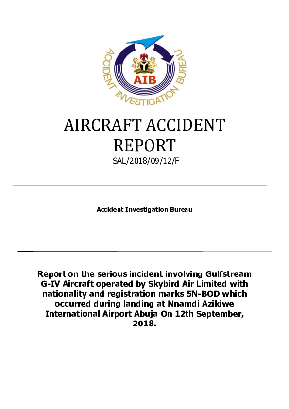 On 12 September 2018, a Gulfstream G-IV overran the runway at Abuja after the air/ground status system failed to transition to ground on touchdown and the crew were slow to recognise that as a result neither spoilers nor thrust reversers had deployed. In the absence of recorded flight data, it was not possible to establish why the air/ground sensing system did not transition normally but no fault was found. The aircraft operator’s procedures in the event of such circumstances were found to be inadequate and regulatory oversight of the operator to have been comprehensively deficient over an extended period.