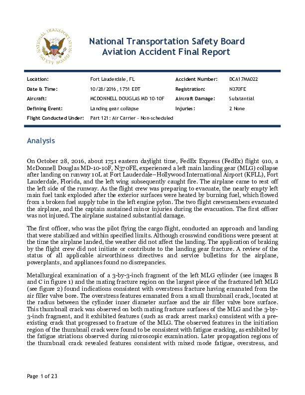 On 28 October 2017 the left main landing gear of an MD10-10F that had just touched down at Fort Lauderdale collapsed which led to the aircraft departing the side of the runway and catching fire. The Investigation found that the collapse had occurred because of metal fatigue which had developed in the absence of protective plating on part of the leg assembly. The reason for this could not be determined but it was noted that had the aircraft operators component overhaul interval not been longer than the corresponding manufacturer recommendation then the collapse would probably not have occurred.