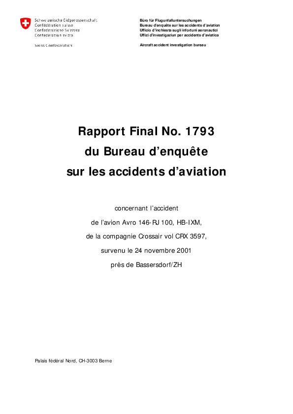 Final Report No. 1793 (French) by the Aircraft Accident Investigation Bureau, RJ1H CFIT near Bassers