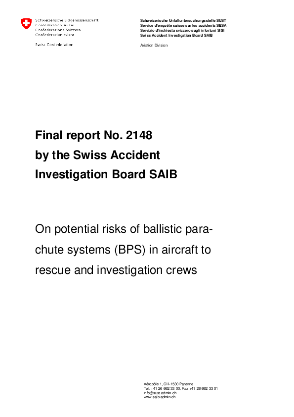 This report contains the Swiss Accident Investigation Board (SAIB)'s final conclusions on the effects of fitting aircraft with ballistic parachute systems (BPS).