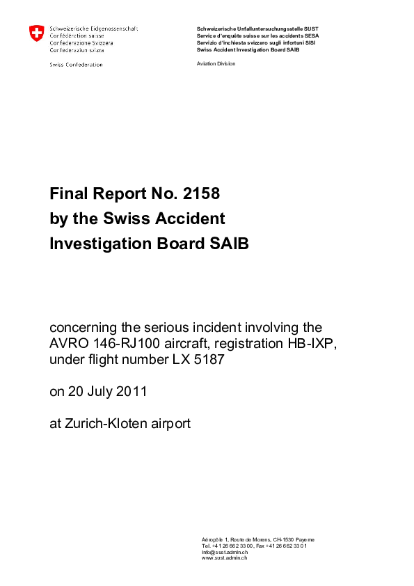 Final Report No. 2158, RJ1H in-flight upset and temporary loss of control, Zurich Switzerland, 20 Ju